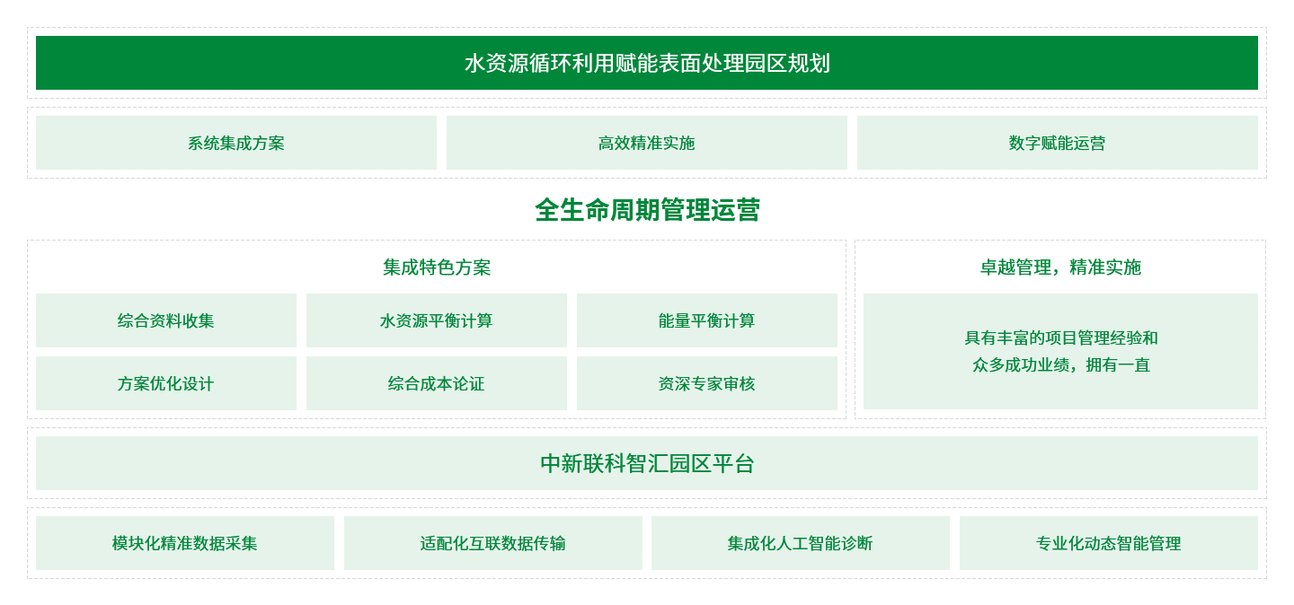 中新聯(lián)科圍繞表面處理等相關(guān)行業(yè)如航空航天、汽車制造、3C行業(yè)、日化行業(yè)、食品行業(yè)化工等高耗水領(lǐng)域,在對(duì)水、鹽、有機(jī)物綜合平衡計(jì)算的基礎(chǔ)上,多方位利用電能、生物能、低溫余熱等資源,為客戶在工業(yè)廢水處理領(lǐng)域提供完整的解決方案和超越方案本身的一站式服務(wù),真正實(shí)現(xiàn)廢水資源化,促進(jìn)綠色、智能、環(huán)保交匯融合。彰顯“表面處理綠色運(yùn)營商”的水處理整體解決方案優(yōu)勢——“低成本、運(yùn)行可靠、資源化”,共享綠色生態(tài),和諧自然。
